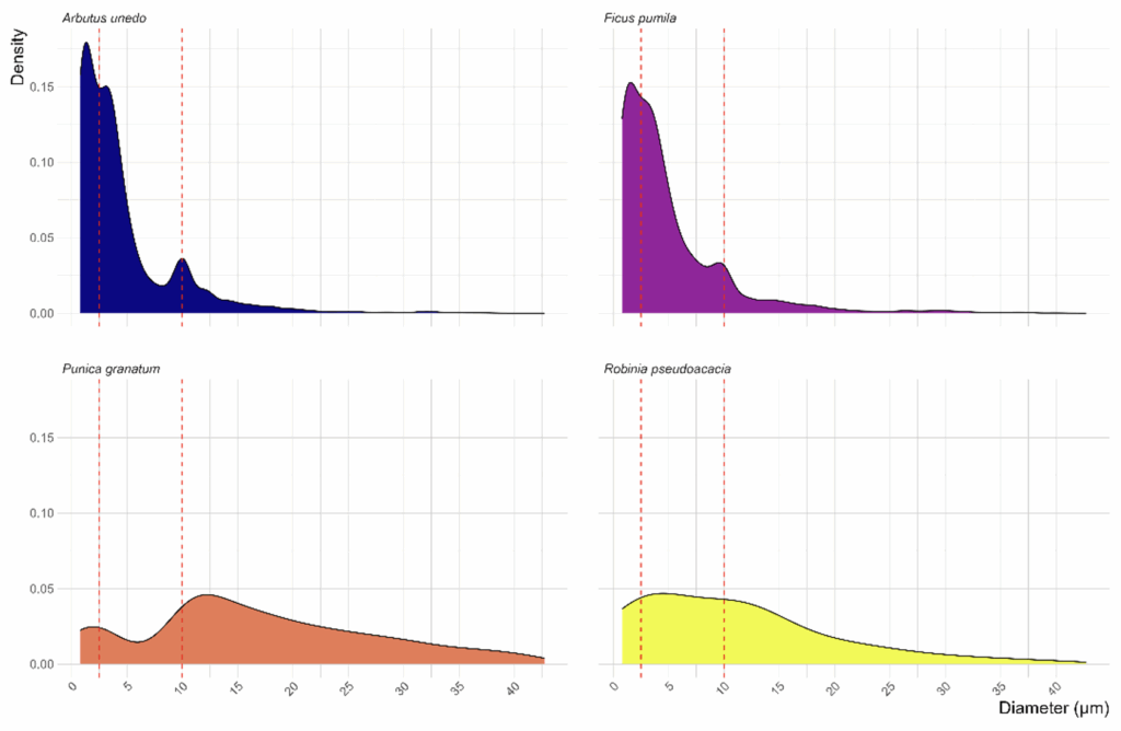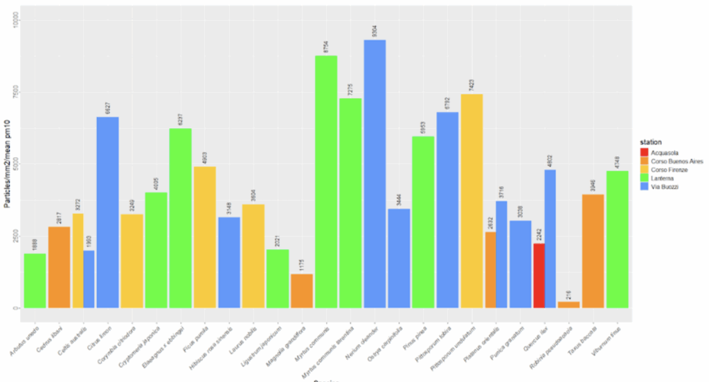 Già così è quindi possibile ottenere una stima delle quantità e dei calibri delle particelle inquinanti che si depositano sulle foglie delle diverse specie vegetali, al netto dalle esposizioni agli inquinanti registrati dalle centraline ARPAL nei diversi luoghi di raccolta. In questo modo si può conoscere per ogni specie il diverso profilo di captazione del particolato atmosferico in base alle sue dimensioni. E come si può osservare in figura, questo dà luogo a un vero e proprio repertorio di specie, alcune delle quali più adatte, per le caratteristiche chimico-fisiche delle loro foglie (per esempio la presenza di cera sulla loro superficie) a ritenere sulla superficie le particelle più fini o più grossolane. Fra queste svettano mirto e oleandro probabilmente a causa della particolare composizione chimica delle loro foglie e della loro struttura generale, ma anche il limone e il pino, che trattengono soprattutto le polveri fini, al contrario della magnolia, del viburno e del pitosforo, decisamente più versatili. Va detto però che le polveri fini e ultrafini, vale a dire sotto i 2,5 micrometri di diametro sono certamente più pericolose per la salute perché più capaci di penetrare in profondità nei polmoni e, in seguito, nell’organismo.