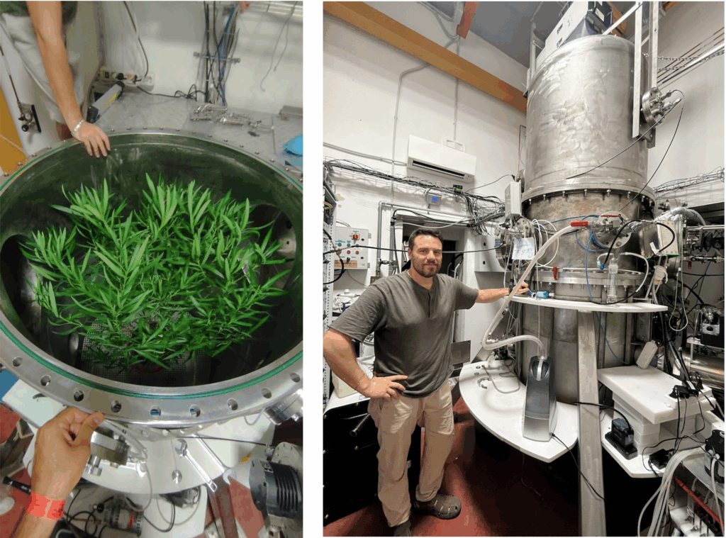 Questi studi iniziali, già così suggestivi, hanno avuto una buona conferma in laboratorio. Il passo successivo della ricerca ha previsto l’inserimento di piante intere all’interno di una camera di simulazione atmosferica, una delle infrastrutture di punta a livello europeo – situata presso i Laboratori del Dipartimento di Fisica (DIFI) dell’Università di Genova. Questa ChAMBRe (Chamber for Aerosol Modelling and Bioaerosol Research), progettata per ricreare in modo controllato le condizioni atmosferiche reali (in termini di gas, aerosol, luce solare, temperatura e umidità), rappresenta un unicum nel panorama italiano. Le sue componenti sono state acquisite grazie alla collaborazione con l’INFN e altri enti di ricerca nazionali, mentre l’assemblaggio e il collaudo finale sono stati curati dai tecnici del DIFI. Oggi, questa infrastruttura appartiene ad una rete di facility di ricerca europee, offrendo un’opportunità avanzata per lo studio sperimentale dell’interazione tra piante e atmosfera, come ci spiega Dario Massabò (DIFI). Mentre di solito si inseriscono nel dispositivo campioni di modesta grandezza come, ad esempio, colture batteriche, nel caso di questo studio intere piante sono state ospitate all’interno della ChAMBRe.